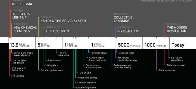 Here's the entire history of the universe in one paragraph: The Big Bang creates the universe and all the matter within it, which slowly accumulates due to gravity until the birth of the first stars, which forge new chemicals and expel these into the cosmos when they die, forming the seeds for planets such as … Continue reading Big History