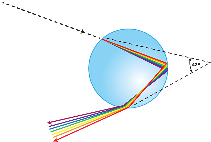 The atmosphere around us is full of water droplets, especially after it has rained and all these little water droplets act like tiny little prisms and split the light. Sunlight enters the water droplet and refracts, splitting into the different colours, then reflects off the back of the droplet and comes back out. This is why you can only see a rainbow if the Sun is behind you. You can also only see a rainbow if the angle between the Sun, water droplets and you is just right – that Goldilocks angle is 42 degrees – because light always reflects off the inside of the water droplet at that angle.