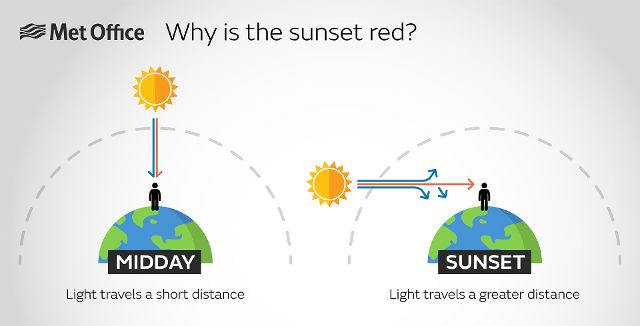 What we haven’t taken into account yet is the angle at which sunlight is incident on the Earth’s surface and as a consequence how much of the atmosphere the light has to go through. The atmosphere can be thought of as a ring around the Earth so when the Sun is directly overhead, light only has to travel a short distance to reach the surface (or more specifically your eyes). However, if the Sun is at an angle the light has to travel longer and longer distances up until the longest distance which is when the Sun is rising or setting on the horizon.